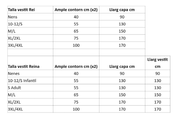 Vestits: Hi haurà vestits de Rei i de Reina. Podeu escollir el que vulgueu! Aquí teniu una guia de talles per tal de saber les mides aproximades.